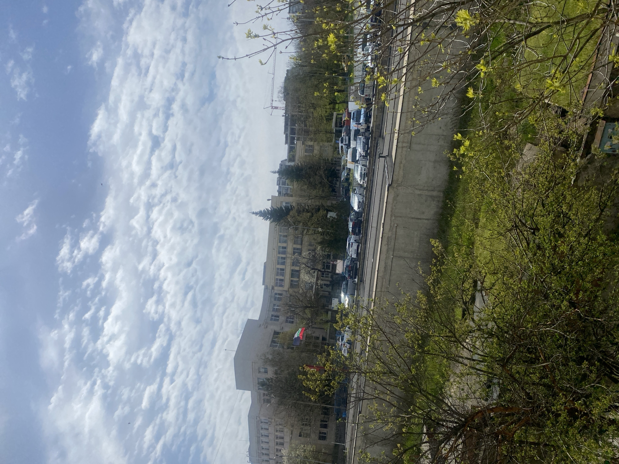 cityscape in Ruse, Bulgaria, taken from an elevated position. The sky is filled with scattered cumulus clouds. In the middle ground, there are several buildings, some of which appear to be governmental or institutional based on their size and architecture. A Bulgarian flag is visible in front of one of the buildings. A row of parked cars lines a street that runs parallel to a concrete embankment or river wall, likely alongside the Danube River. Trees with new spring foliage frame the foreground. A construction crane is visible in the background near some taller buildings.