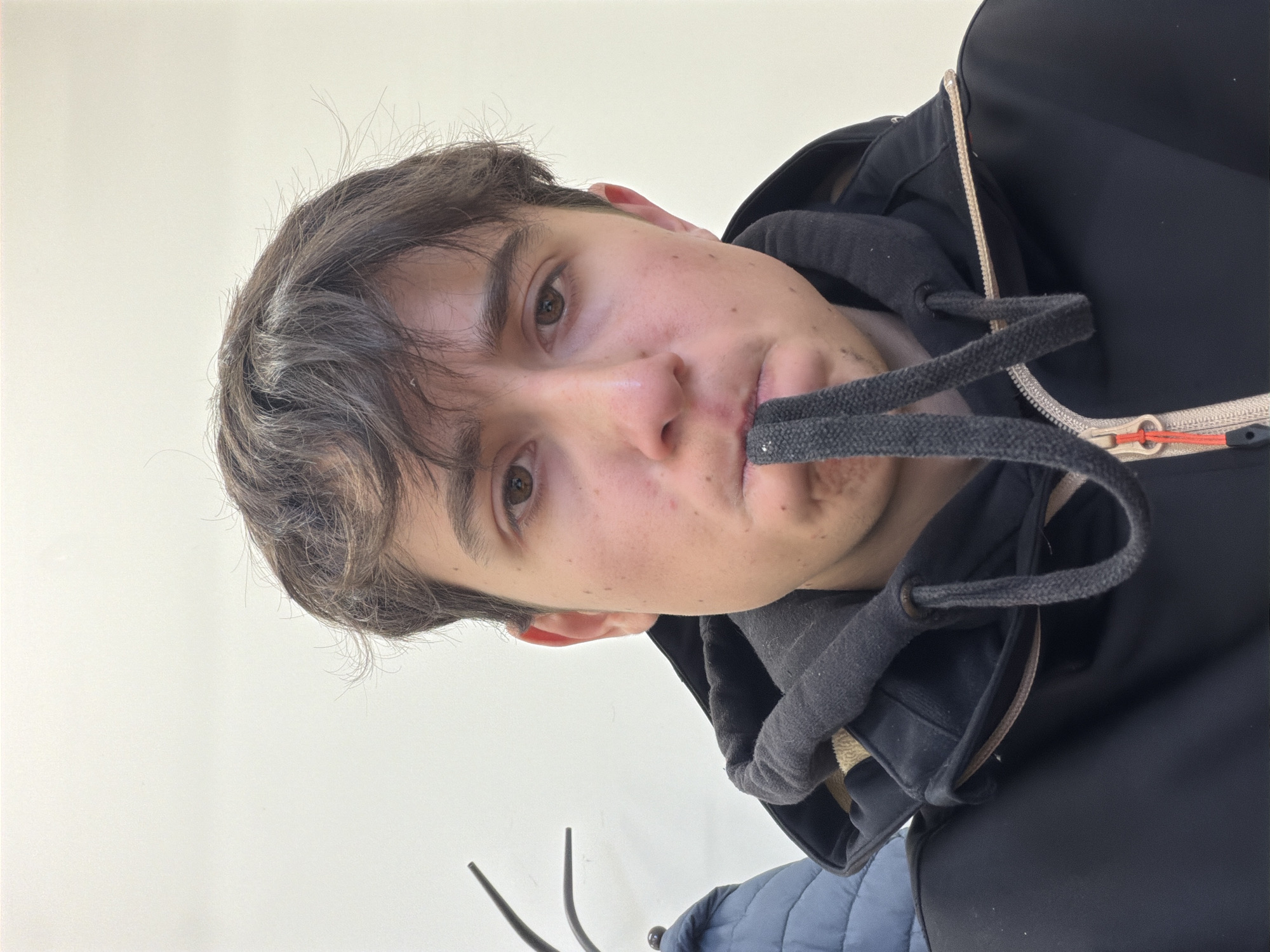 A close-up, medium shot depicts a young man with brown hair and brown eyes. He is wearing a dark-colored hooded jacket. The hood's drawstrings are visible, with one held near his mouth. The man's skin tone is fair, and some blemishes are visible on his face. The background is a plain, light-colored wall. The lower part of the image reveals the top of another jacket, quilted and in a blue tone. There is no identifiable location in Sofia, Bulgaria, present in the image.
