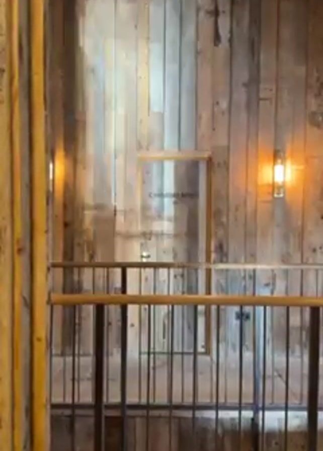 view of a building interior with wood paneling on the walls. A metal railing runs across the lower half of the frame, creating a sort of balcony or mezzanine. There is a "CHANGING ROOM" sign on a door, centered between two light fixtures on the wall. The light fixtures have a warm, yellowish glow. The overall impression is a rustic or industrial aesthetic.