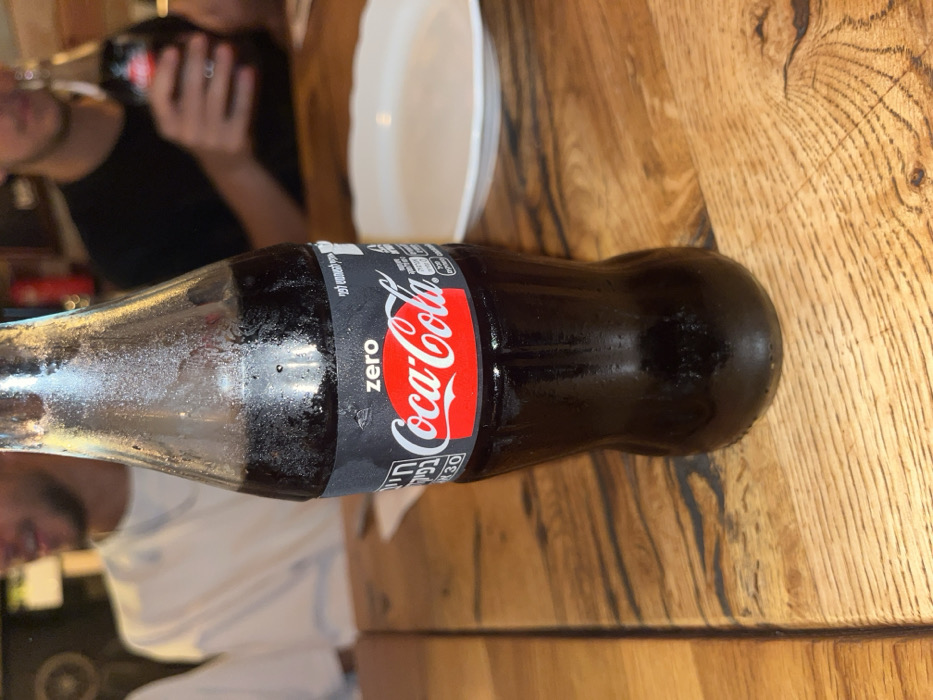 The image depicts an indoor scene within a restaurant or cafe setting in Ashdod, Israel. The primary subject is a cold, glass bottle of Coca-Cola Zero, positioned prominently in the foreground and center, exhibiting condensation droplets on its surface. The bottle features a black label with "zero" in white text and the red and white "Coca-Cola" logo. Hebrew text is visible on the label. The bottle rests on a dark, polished wooden table with distinct grain patterns and lighter striations. To the right of the bottle, a white, empty plate with a fluted edge is visible on the table. In the blurred background, two individuals are partially visible. To the left, a person wearing a white short-sleeved top and a silver chain is seated, facing right. To the right, another person wearing a dark short-sleeved top is seated, holding a second, similarly blurred Coca-Cola bottle in their right hand. The ambient lighting suggests an indoor evening environment.