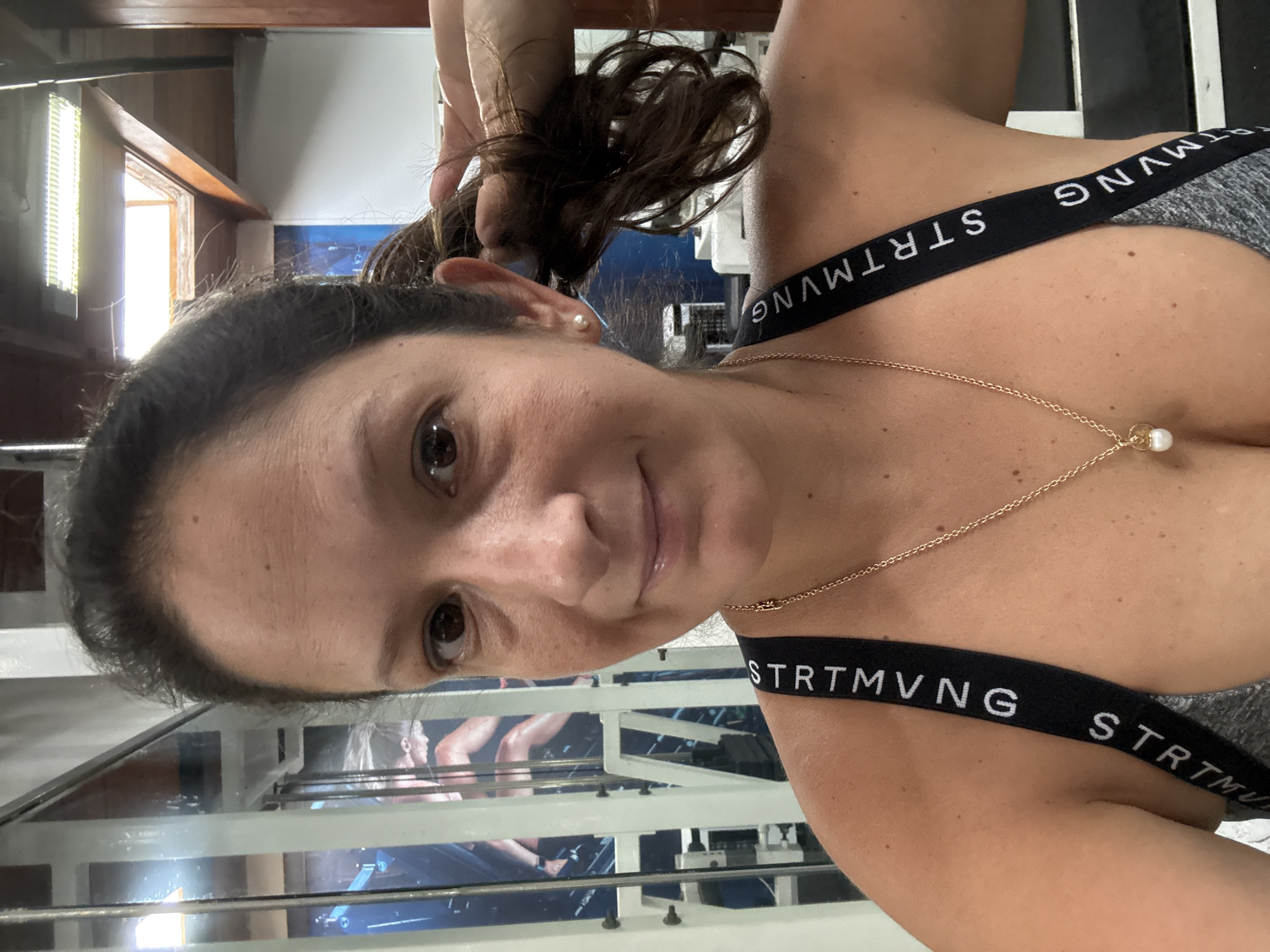 A woman with dark hair is posing for a selfie. Her hair is partially pulled back, and she is wearing a gray sports bra with black straps that say "STRTMVNG". She also has a gold necklace with a pearl pendant. The background appears to be a gym with workout equipment and posters of athletes. It is not possible to determine the exact location within Ancón, Peru, based solely on this image.