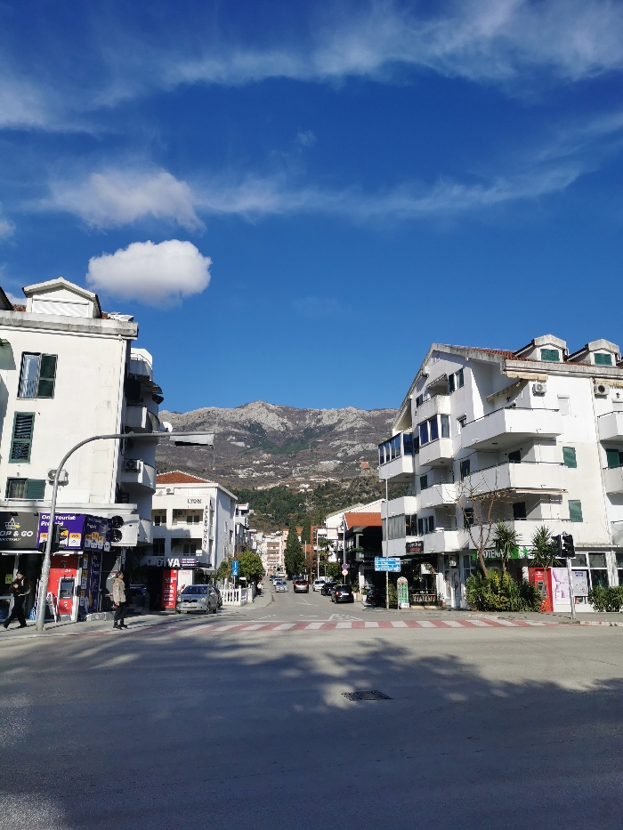 The image depicts an urban street intersection in Budva, Montenegro, specifically at the crossroads of Mediteranska Ulica and Mainska Ulica, observed under clear daylight conditions