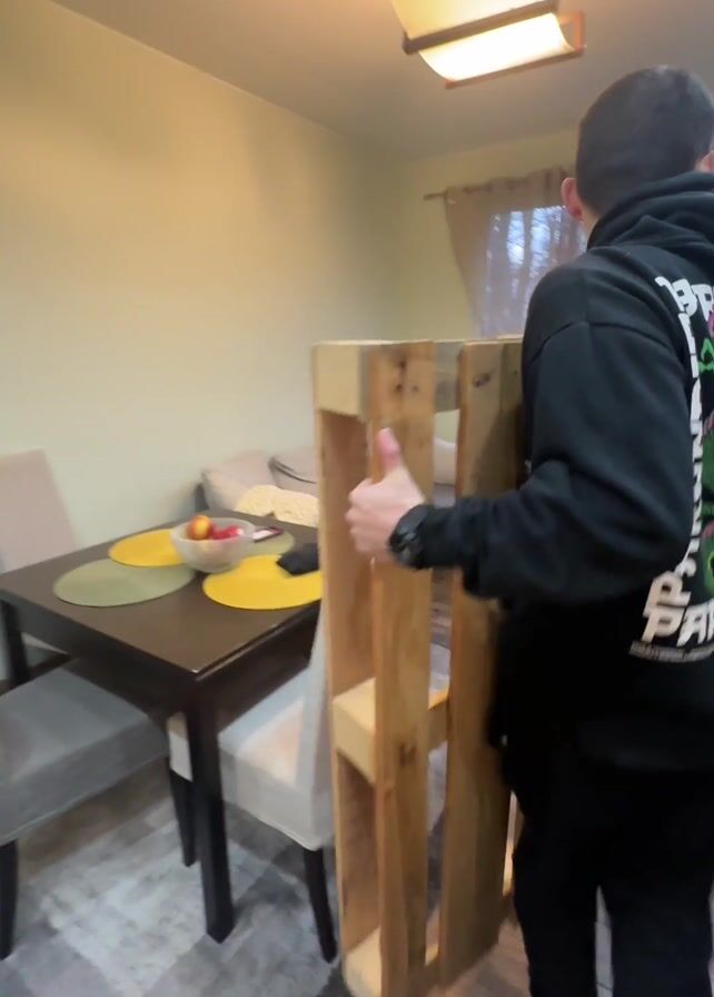 A man in a black hoodie, black pants, and white shoes carries a wooden pallet across a room with wooden flooring and a light beige wall