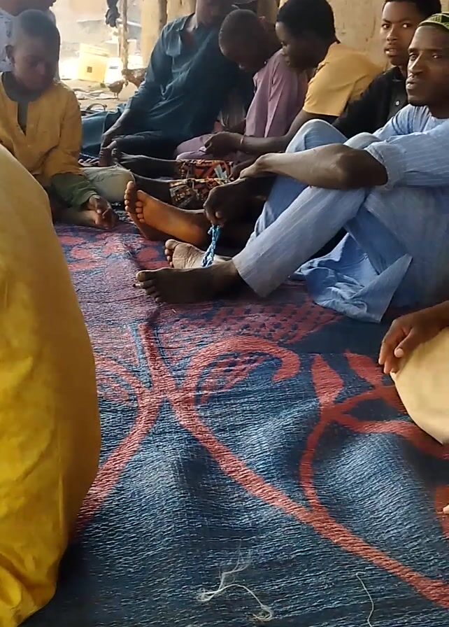 A group of children and adults are sitting and kneeling on a rug with a colorful geometric pattern. The main focus is on a child in a yellow robe who is bent forward in a kneeling position, seemingly praying or bowing. The rug is laid out on what appears to be the ground outdoors, with glimpses of surroundings like a tire and building structures in the background.