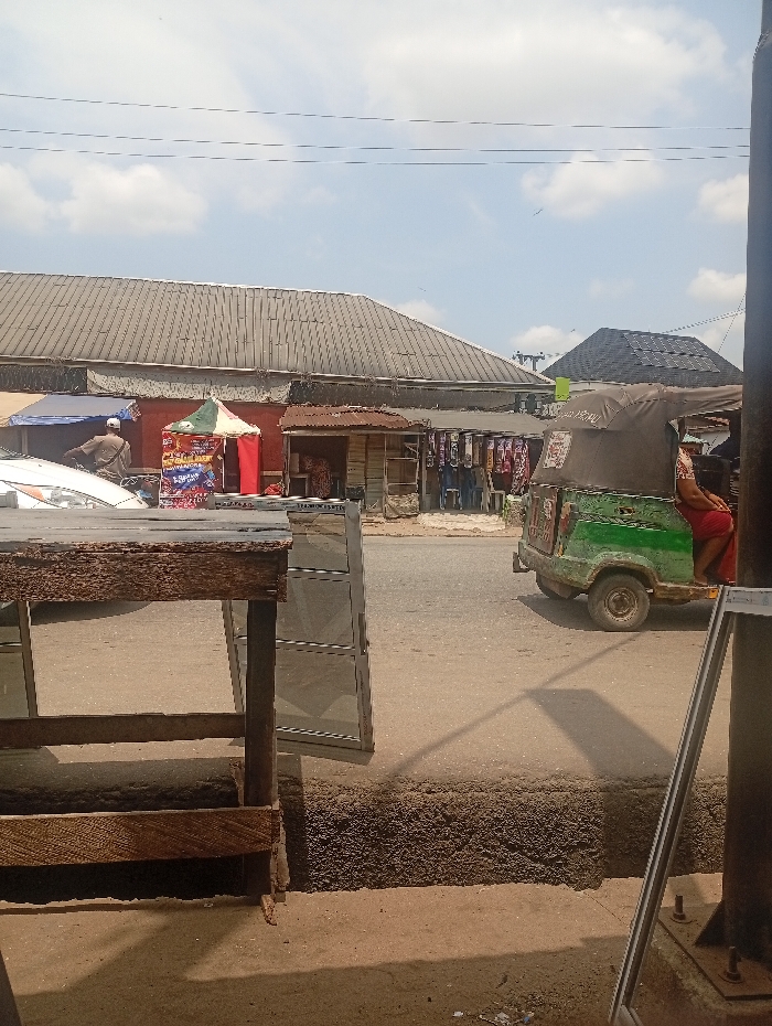 The image depicts a daytime street scene in Umuode, Nigeria. In the foreground, a weathered wooden stand, comprising a tabletop and visible support legs with a lower brace, occupies the left side. To the right, a vertical metallic frame leans against an unseen structure. The mid-ground features an asphalt road with a raised, textured dirt/concrete shoulder. On the road, a white sedan's front section is partially visible on the left. To its right, a green three-wheeled auto-rickshaw (Keke Napep) with a tan fabric canopy is positioned. A person wearing a red garment is partially visible within the auto-rickshaw. Standing near the white sedan is a person in a light-colored cap and a brown long-sleeved shirt, facing away from the camera. The roadside behind the vehicles is lined with informal commercial structures. These include a blue tarp awning, a small, multi-colored tent displaying advertising, and a series of stalls, some with corrugated metal roofs or simple coverings. Merchandise, including textiles, is visible at some stalls. In the background, a large building with a grey corrugated metal roof extends across the scene, housing several of the roadside businesses. Further to the right, another building with a dark-colored roof is visible. The sky overhead is bright with scattered white clouds, indicating daylight conditions and casting visible shadows on the road.