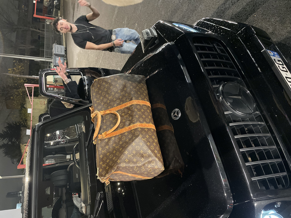 A black Mercedes-Benz G-Wagon is parked, with a large brown Louis Vuitton duffel bag placed on its hood