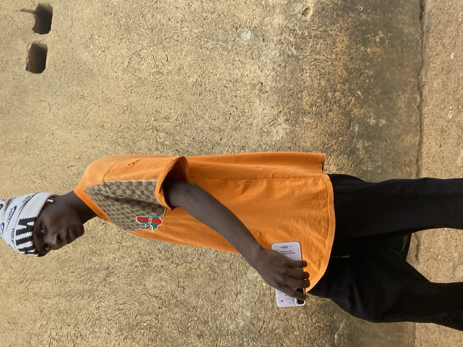 A young Black man wearing an orange shirt with Gucci-patterned sleeves and a Nike headband stands against a textured wall. He holds a phone in his hand. He is dressed in black pants. The wall has two square holes near the top left corner. The light gives the wall an earthy tone.