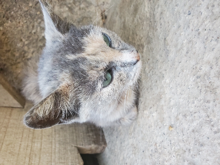 A vertical medium close-up image displays a domestic cat emerging from beneath a wooden structure on a light grey concrete surface. The cat possesses a tortoiseshell coat, featuring mottled grey, white, and pale orange-brown fur, with prominent green eyes looking downwards and slightly left. Several white whiskers extend from its muzzle. The wooden structure in the upper left background consists of light-colored planks. The concrete foreground shows a coarse texture and minimal light-brown particulate debris. No other subjects or interactions are present. The scene is situated in Gwong, Nigeria.