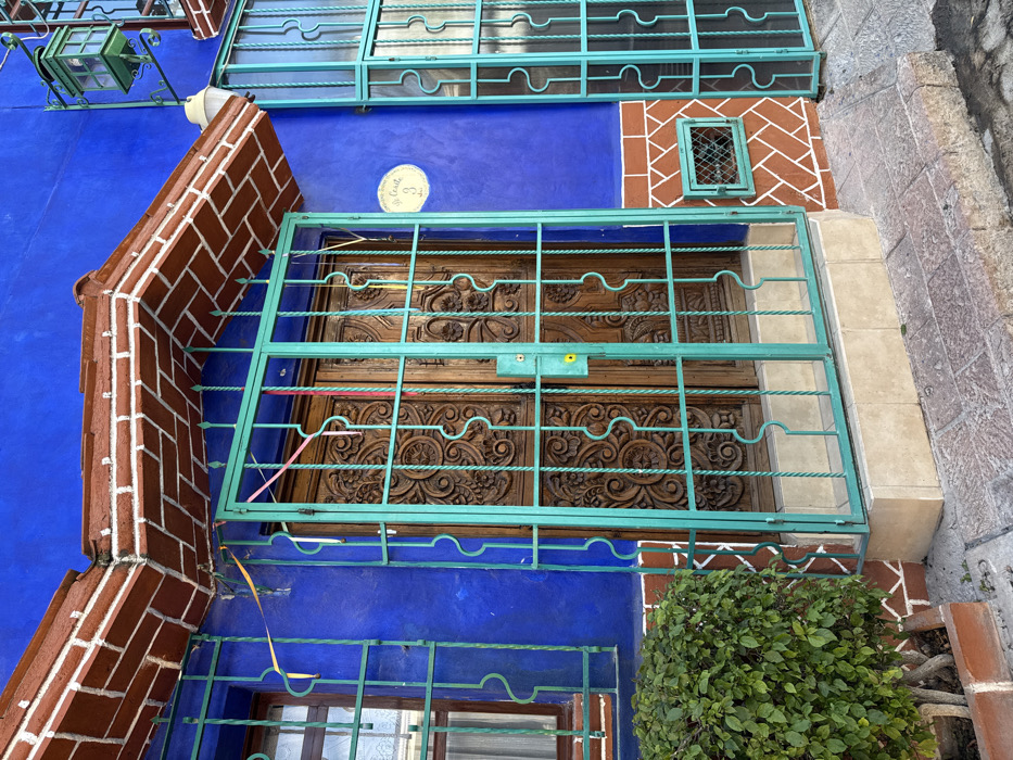 A vibrant blue building facade features an intricately carved wooden door protected by a turquoise metal grate