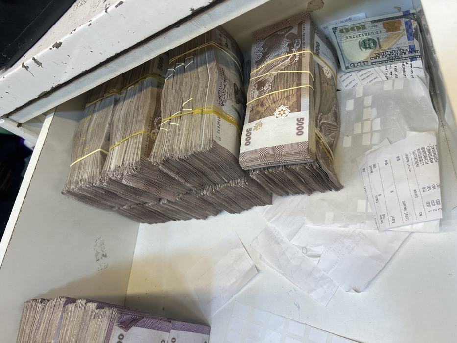 An open safe drawer reveals stacks of banded Syrian 5000 currency notes, alongside bundled American $100 bills. A receipt indicates cash transactions in USD, totaling $800, with serial numbers documented. The presence of both currencies suggests possible exchange activities or mixed holdings. Loose papers and white squares are scattered around the money.