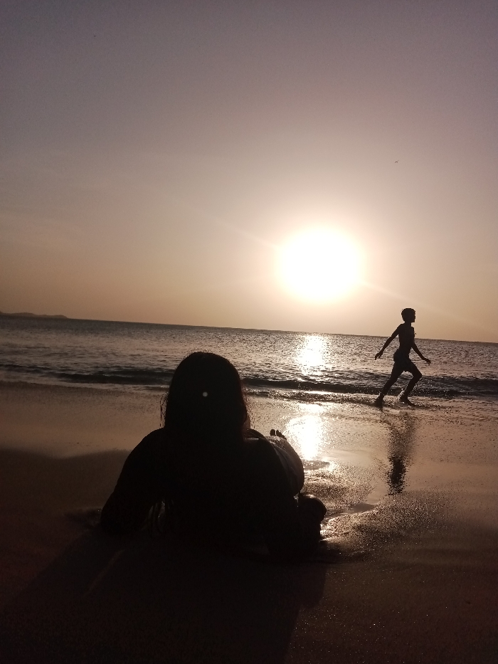 The image displays a coastal scene at sunrise or sunset on a beach in Juan Griego, Venezuela. In the foreground, a person with dark hair is lying prone on the wet sand, facing away from the camera and towards the ocean. Their form is a dark silhouette against the brighter background. In the mid-ground, a second individual, appearing slender, is running or wading through the shallow water at the shoreline, moving from left to right across the frame. This figure is also a dark silhouette. The sun, a bright, circular light source, is positioned low on the horizon over the ocean, creating a prominent reflection path extending across the water towards the foreground. The sky transitions from a light purple-grey at the top to warmer orange and yellow tones near the horizon. A distant landmass is visible on the far-left horizon. A small, dark aerial object is present in the upper-mid portion of the sky. The sand in the foreground and near the water's edge appears wet and reflective.