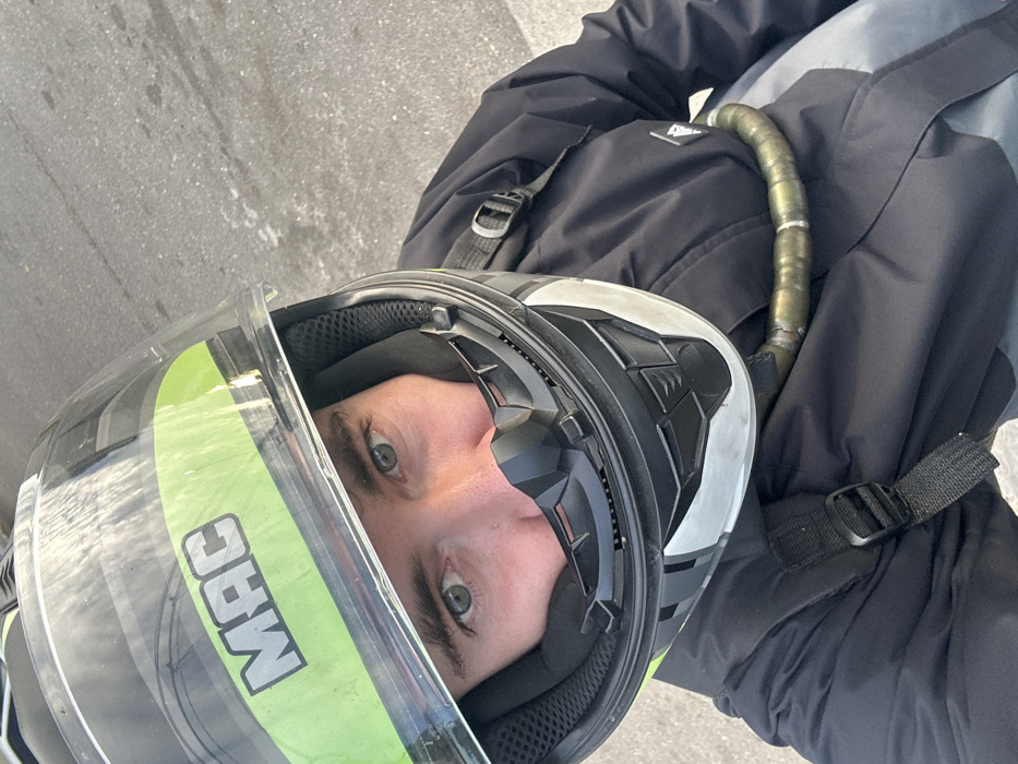 A male individual is depicted in a close-up, high-angle shot, from the upper torso upwards. He wears a black full-face motorcycle helmet with a prominent lime-green horizontal stripe across the forehead, featuring the "MAC" brand in silver lettering. The clear visor is slightly reflective. His light green/hazel eyes and the upper bridge of his nose are visible through the helmet's opening. He is dressed in a black, possibly insulated, jacket, with a black backpack strap and buckle visible on his left shoulder. A segmented, metallic, gold-toned tubular object, resembling a security chain or lock, is looped around his torso over the jacket. The background is an out-of-focus, dark grey paved surface, indicative of an outdoor street or parking area. The scene is illuminated by natural light, consistent with daylight conditions in San Fernando del Valle de Catamarca, Argentina. The individual's gaze is directed towards the camera.