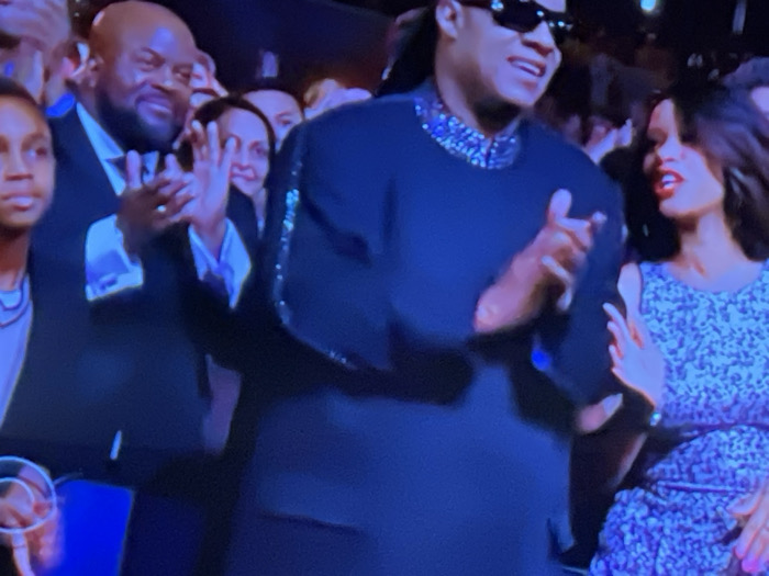 The image depicts an indoor scene in Pazardzhik, Bulgaria, featuring multiple individuals engaged in an event. In the foreground-center, a male subject, identifiable by dark skin, short dreadlocks or braids, and dark sunglasses, is shown wearing a dark long-sleeved garment with a prominent, sparkling blue or silver beaded collar and matching cuffs. He is actively clapping with both hands raised to chest height, smiling slightly. To his immediate left, a bald, bearded male subject in a dark suit with a white shirt is also clapping, with a ring visible on his left hand, and appears to be smiling. A portion of a younger individual is visible on the far left. To the right of the central figure, a woman with dark, wavy hair is present, wearing a light-colored, patterned dress. She is smiling or speaking, with her right hand slightly raised. The background is dark and out of focus, indicating an audience or a staged event, with other indistinct figures present.