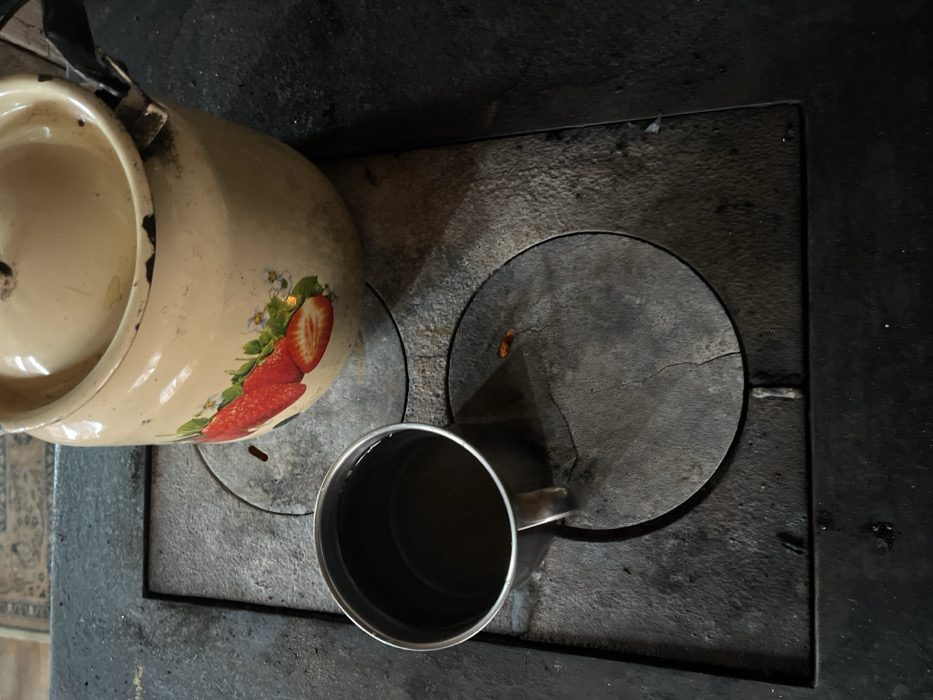 The image displays an overhead perspective of a domestic scene within the city of Lesidren, Bulgaria. The central focus is a dark, heavily used cast iron stove top, featuring multiple circular removable plates. On the left side of this surface, a silver-toned metal mug is positioned, containing a dark liquid filling approximately 85% of its volume. To the right, a cream-colored enamel pot or kettle, decorated with a red strawberry motif, rests on an adjacent section of the stove. This pot exhibits visible wear, including chipped enamel. A small, glowing orange particulate is evident on the stove surface between the mug and the pot. The stove top itself shows a textured finish, along with accumulations of dust and minor surface cracks on one of the plates. In the upper background, a blurred portion of a light-colored, patterned rug is visible. No individuals or active interactions are present in the frame.