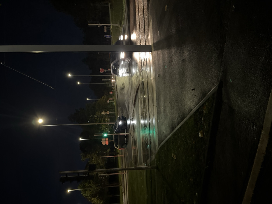 This image depicts a nighttime view of the intersection of Boulevard Lycée Laplace, Rue de l'Avenir, and Rue du Gaillon in Caen, France, located near the Lycée Laplace tram stop. The scene is illuminated by multiple artificial light sources, including streetlights and vehicle headlights, which create strong reflections on the wet, asphalt road surface, indicating recent precipitation. No individuals are visible. In the middle ground, a dark-colored SUV or crossover with illuminated headlights is positioned on the left side of the intersection, facing a green traffic signal. To the right, a lighter-colored SUV or crossover, also with illuminated headlights, is moving through the intersection, casting bright light onto the wet tram tracks and pavement. The infrastructure includes multiple grey poles supporting traffic lights and overhead lines for the tram system. A pedestrian crossing, marked by white stripes, is visible in the foreground. Road signage includes a red circular 'no stopping or parking' sign (Panneau B6a1) positioned on the right side of the road, and several triangular warning signs with red borders are clustered in the background. Trees with dark foliage line the perimeter of the roadways, and a grass verge with scattered leaves is present in the immediate foreground to the left.