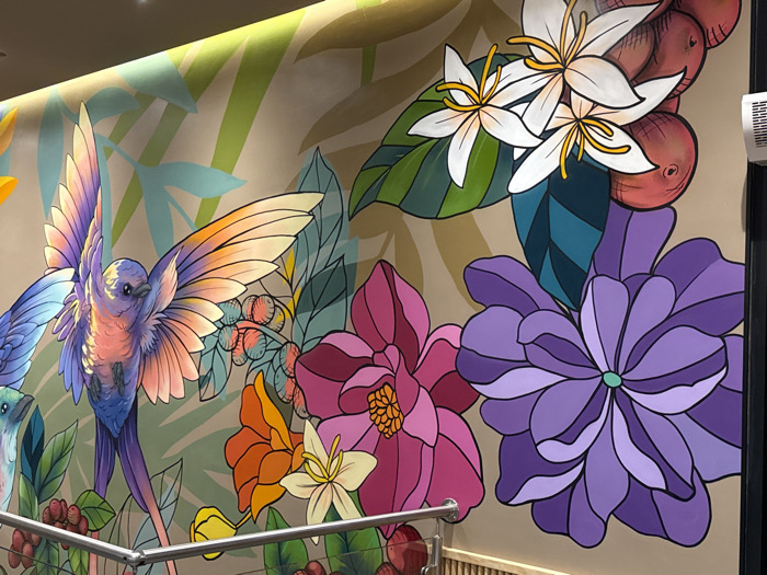 The image displays a detailed, stylized mural on an interior wall in Santa Tecla, El Salvador. The mural features tropical flora and fauna against a light beige background. A prominent, multicolored bird, characterized by iridescent blue, purple, orange, and pink hues across its body and large, outstretched wings, occupies the central left portion of the mural, depicted in mid-flight and facing right. A section of a smaller, light blue bird is visible at the lower-left edge. The upper-right section of the mural presents white coffee blossoms with yellow pistils, alongside clusters of red coffee cherries and dark green leaves. Below these, a large, multi-petaled purple flower is depicted, occupying the lower-right quadrant. To its left, a similarly large, multi-petaled pink/magenta flower is present. Smaller orange and white flowers are visible towards the lower-center. Various light green and teal foliage elements are integrated throughout the mural's background. A linear light fixture is installed along the top edge of the wall, providing indirect illumination. In the lower-left foreground, a silver-colored metal railing, consistent with a staircase or barrier, partially obscures the mural. A white rectangular wall vent or fixture is visible on the far right edge of the wall, above the purple flower. No individuals or dynamic actions are present in the scene.