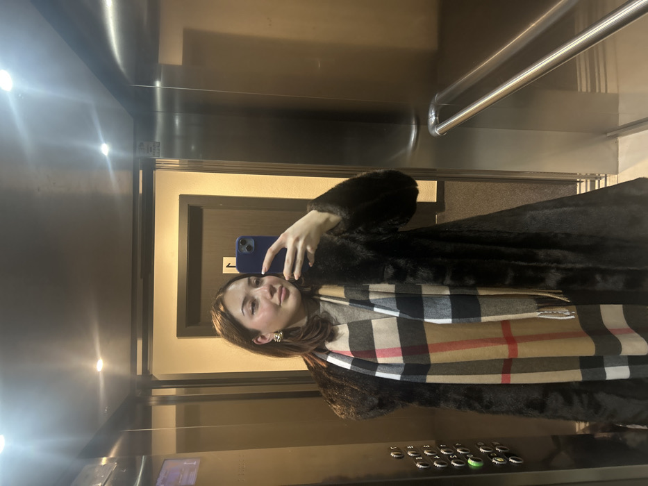 In an elevator, a woman takes a mirror selfie with a blue phone. She wears a black fur coat and a plaid scarf. Elevator features include a metal handrail, brushed metal walls with lighting, and a floor button panel. The image orientation is off, showing the elevator sideways. A doorframe is visible behind the woman.