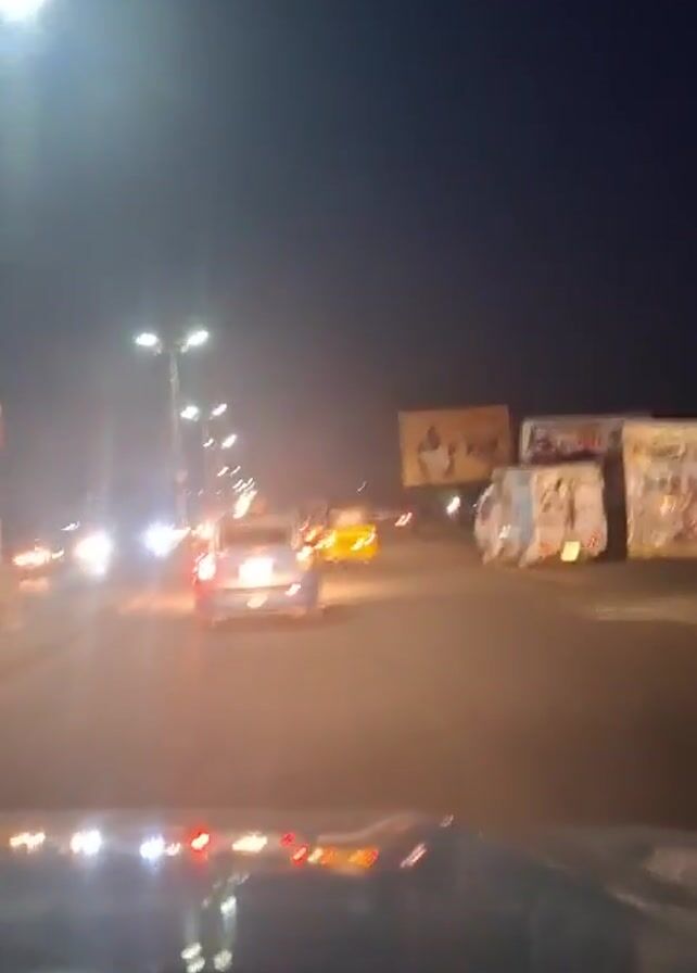 car driving on a brightly lit street at night. There are other vehicles on the road, including cars and auto rickshaws. There are also large billboards on the side of the road. The sky is dark.