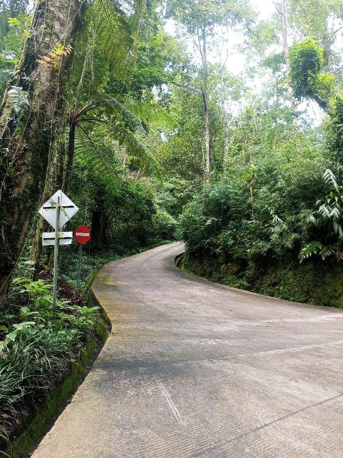 The image depicts a concrete road winding through a dense, green forest in Padegaon, India
