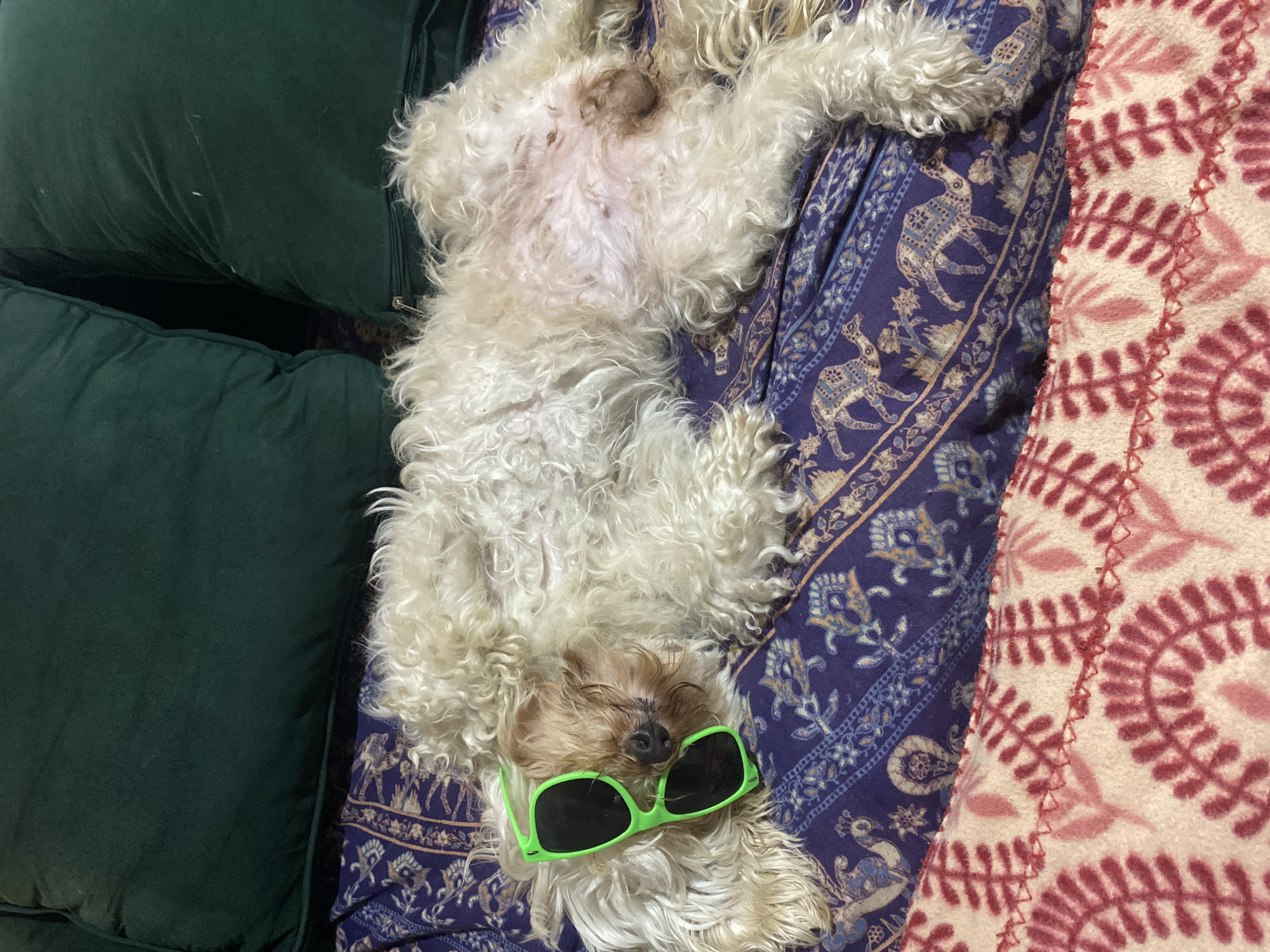 A dog lies on its back on a patterned blue and white blanket, with a green cushion partially visible on the left. The dog has curly, light-colored fur and wears green sunglasses. A cream and pink patterned blanket is to the right of the blue blanket.