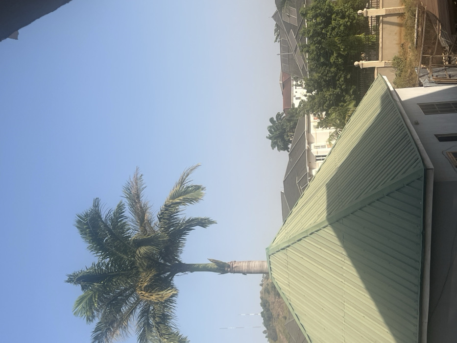 This daytime image captures a suburban residential scene in Abuja, Nigeria. In the immediate foreground, a light green corrugated metal hip roof occupies the lower left and center, featuring a distinct diagonal shadow across its surface. A tall palm tree with a thick, segmented trunk and extensive green fronds stands centrally in the midground, its top extending into a clear, light blue sky. To the left of the palm tree, a distant, treeless hill with two slender vertical mast structures is visible. Behind the foreground roof and to the right, multiple residential buildings with varying dark-colored roofs are observed amidst dense green foliage. One prominent structure appears to be a cream-colored, multi-story building. On the far right, a concrete fence with decorative pillars borders an unkempt area of dry earth and sparse vegetation. No human figures or discernible activities are present.