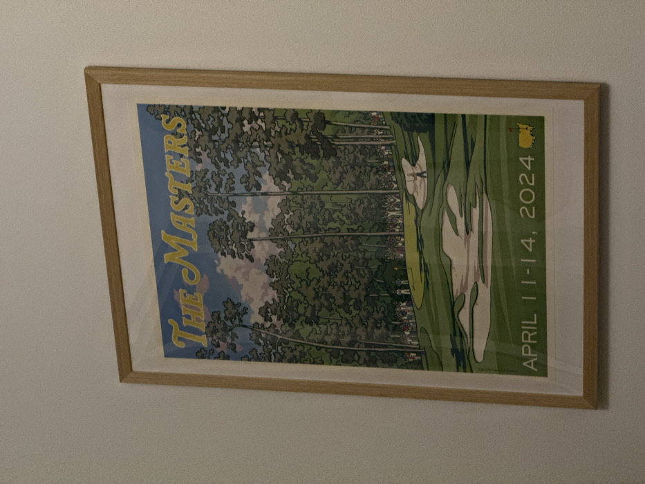 A framed poster is depicted hanging on a plain, light-colored wall in Frederiksberg, Denmark. The poster is encased in a light-toned wooden frame with a white mat. The central subject of the poster is an artistic illustration of a golf course scene. The top section displays the text "THE Masters" in stylized yellow script against a blue sky with scattered white clouds. The middle ground illustrates a golf green with a visible flagstick, multiple white sand bunkers, and a dense background of tall green trees. Stylized figures represent a golfer engaged in a swing from a bunker on the right, another figure standing near the flagstick, and numerous spectators lining the course perimeter. The bottom section of the poster displays the dates "APRIL 11-14, 2024" in capital letters, accompanied by a small green golf flag logo superimposed on a yellow geographical outline. The poster is viewed at a slight angle, with minor surface reflections.