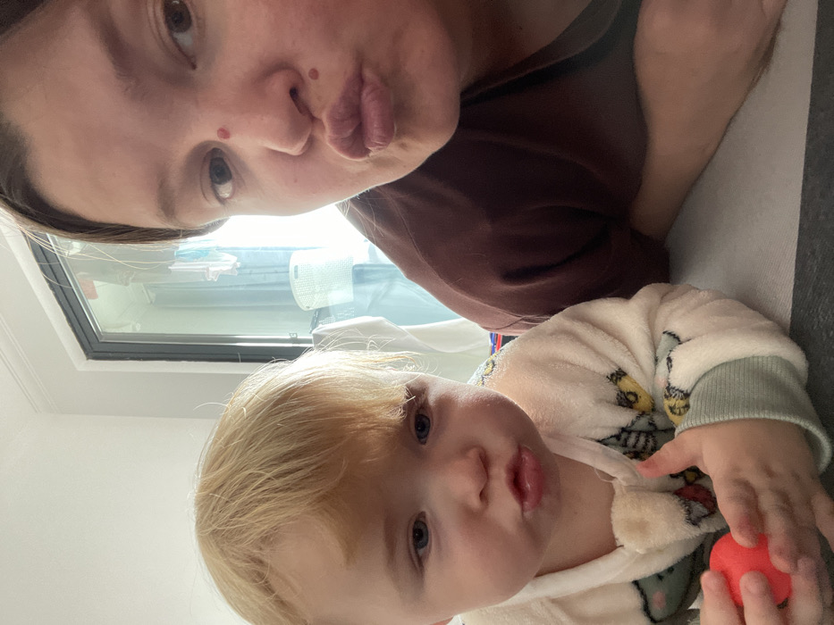 A selfie captures a woman and a toddler. The woman is at the top of the frame with her lips puckered. The toddler is below, wearing a soft, patterned garment and holding a red toy. The background includes a window. The lighting is bright. Both faces are clearly visible and display neutral expressions. The angle of the photo is slightly tilted.