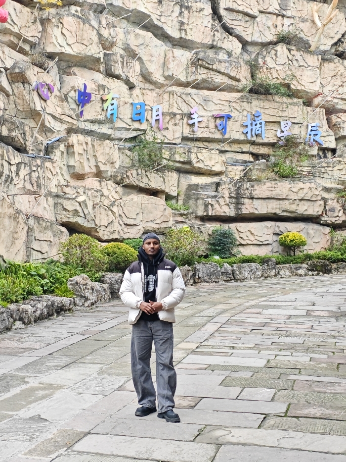 A man stands centered on a gray stone pathway. He wears a white puffer jacket over a black hoodie, gray pants, and black shoes. Behind him, a large, multi-tiered rock formation looms, with Chinese characters affixed to it. Green plants and shrubs line the base of the rock and flank the path. The sky is overcast, creating soft, diffused lighting. The overall scene suggests a park or scenic area.