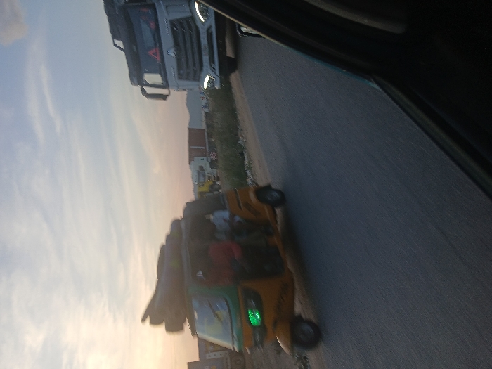 The image displays a road scene in Ajaokuta, Nigeria, during late afternoon or dusk. In the immediate foreground, a dark vehicle window frame is visible on the right. The midground features a yellow and green three-wheeled motorized rickshaw, known as a Keke Napep, in motion from right to left. It carries multiple dark, tubular objects strapped to its roof and contains several blurred occupants. The front of the rickshaw exhibits illuminated green lights. To its right, a large white tractor-trailer truck is positioned, its headlights illuminated. The road surface is dark asphalt. The background reveals additional trucks, one with a red cargo container, and sparse dry vegetation along the roadside. Distant hills are visible under a light blue sky with scattered clouds.