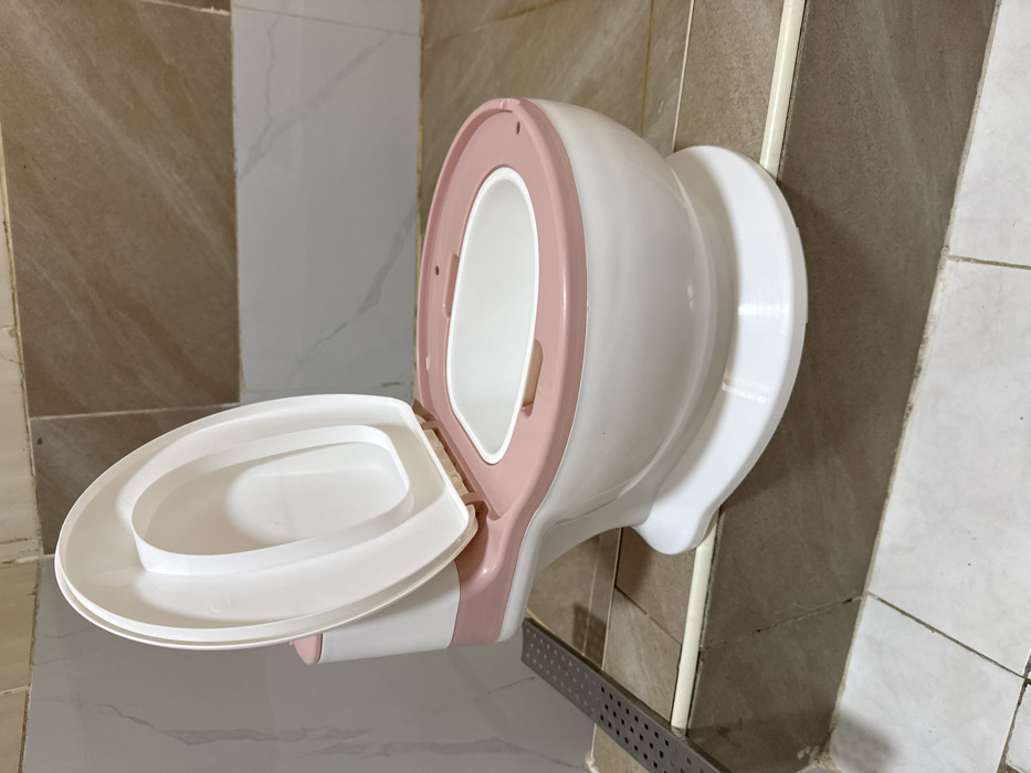 - "A white and pink child's potty training toilet is situated on a raised tiled platform within an interior space in Alaguntan, Nigeria" by FM-Aszrs1, licensed under CC BY 4.0