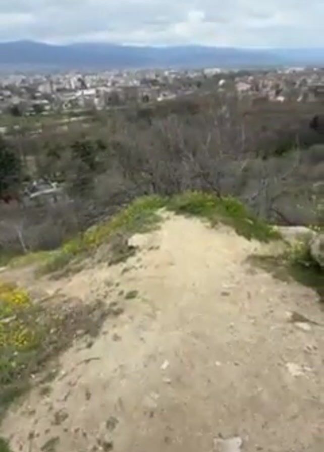 first-person view from a high point overlooking a cityscape. The foreground is a dirt path on a hill with small rocks and patches of green and yellow vegetation. A person's foot in a sneaker is visible on the path. The view opens to reveal a city sprawling across the landscape, interspersed with trees, under an overcast sky. Bare tree branches frame the view. In the distance, a mountain range can be seen. The camera slowly pans upwards, showing more of the sky and cityscape.