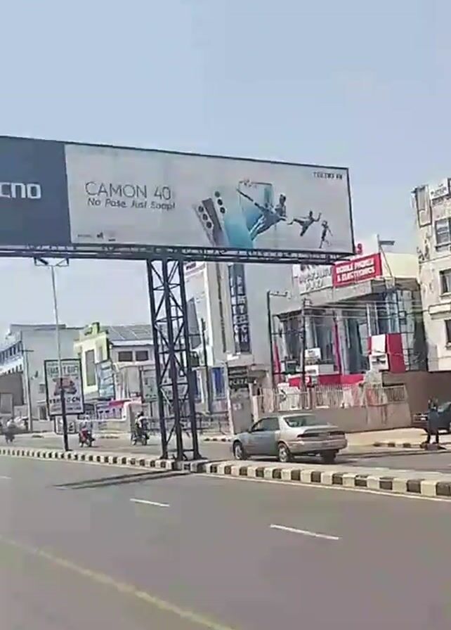 street in Ilorin, Nigeria. The street has multiple lanes and a billboard for Tecno Camon 40 phones. There are motorbikes on the road, and buildings along the sides of the street. The weather is sunny.