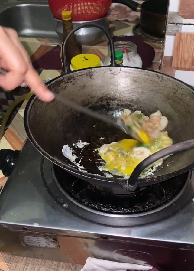 A person is cooking in a kitchen. The person's arm and hand are visible using tongs to stir and separate an egg being cooked in a wok on a gas stove. There are other cooked ingredients mixed with the egg, including what appears to be onions and green peppers. In the background, there's a sink, various jars and containers, and a red colander. The kitchen has tile backsplash and a small section of countertop visible. A maroon towel is placed beside the stove.