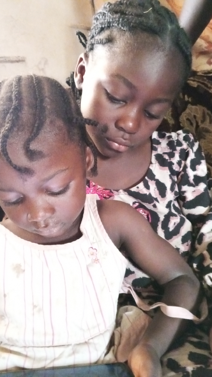 Two young Black females are depicted in an indoor, close-up, portrait-oriented photograph within the city of Unknown, Unknown. The foreground subject, a younger girl, wears a light-colored sleeveless top with faint vertical stripes and a small embroidered design on the left chest, showing some light staining. Her braided hair features specific curves on the forehead. She is positioned slightly left of center, looking downwards, with her right arm visible. Behind her and slightly to the right is an older girl or young woman with braided hair, wearing a long-sleeved top with a black and light-colored leopard print pattern. A hint of pink/magenta fabric is visible near her left shoulder. She is also looking downwards, aligning her gaze with the foreground subject, implying a shared focus on an unseen object located below the bottom edge of the frame. The older subject is supported by or resting against a patterned, upholstered surface in shades of brown and black. The background is indistinct.