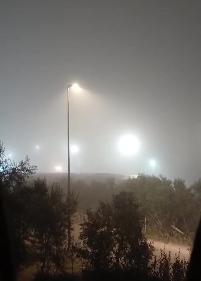 foggy, outdoor night scene with several bright lights visible through the fog