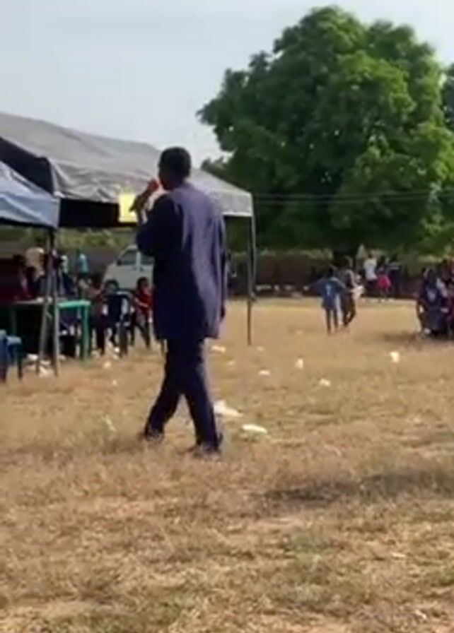 A man is speaking into a microphone in an outdoor setting. He is facing towards the left, gesturing with his right hand. Behind him, there are people seated under a blue and grey tent. There is a white van visible in the background. There are other people standing and walking around in the field. The ground is dry and covered with debris. Another man walks past him to the right, raising his right arm.