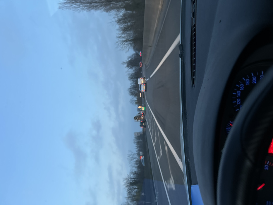 A car travels on a highway with multiple lanes. Other vehicles are visible ahead, including a white van. Trees line the roadside under a cloudy sky. The dashboard of the car is in the foreground, with a speedometer registering the speed. A steering wheel is visible, suggesting the perspective is from the driver's seat.