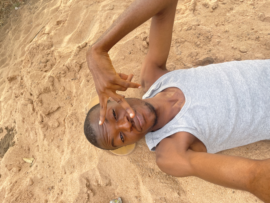 A person lies on light brown sand, head resting on a tan sandal. The individual, wearing a gray tank top, looks directly at the camera with a slightly tilted head. Their dark hair is closely cropped, and a trimmed beard lines their jaw. One arm extends above their head, fingers forming a gesture. The sand appears smooth and slightly textured with occasional darker spots. A small, crumpled item sits at the bottom of the frame.