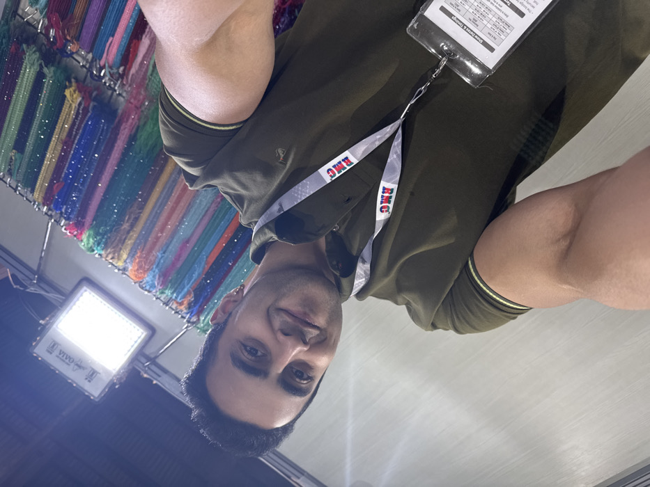 An upward-angled, selfie-style photograph depicts a light-skinned adult male indoors. The subject, positioned centrally, presents a subtle smile and looks directly at the camera. He wears a dark olive green polo shirt with thin light-colored stripes on the sleeves. Around his neck is a grey lanyard featuring repeated "RMC" text in red, green, and blue, connected to a clear plastic identification holder. The badge within the holder displays partially legible text, including sections for "Show Dates & Timings" and dates such as "16.10.19," "17.10.19," and "18.10.19," with corresponding times. The background to the left features a bright, square LED panel light fixture mounted high. To the right, a retail or exhibition display rack is visible, heavily laden with numerous hanging strands of small, sparkling, multi-colored beads or sequins in various hues including blue, green, pink, purple, orange, red, and yellow. A plain, light-colored wall or partition is present in the lower left background. The precise location within Jaipur Municipal Corporation, India, cannot be determined from the visual information provided in the image.