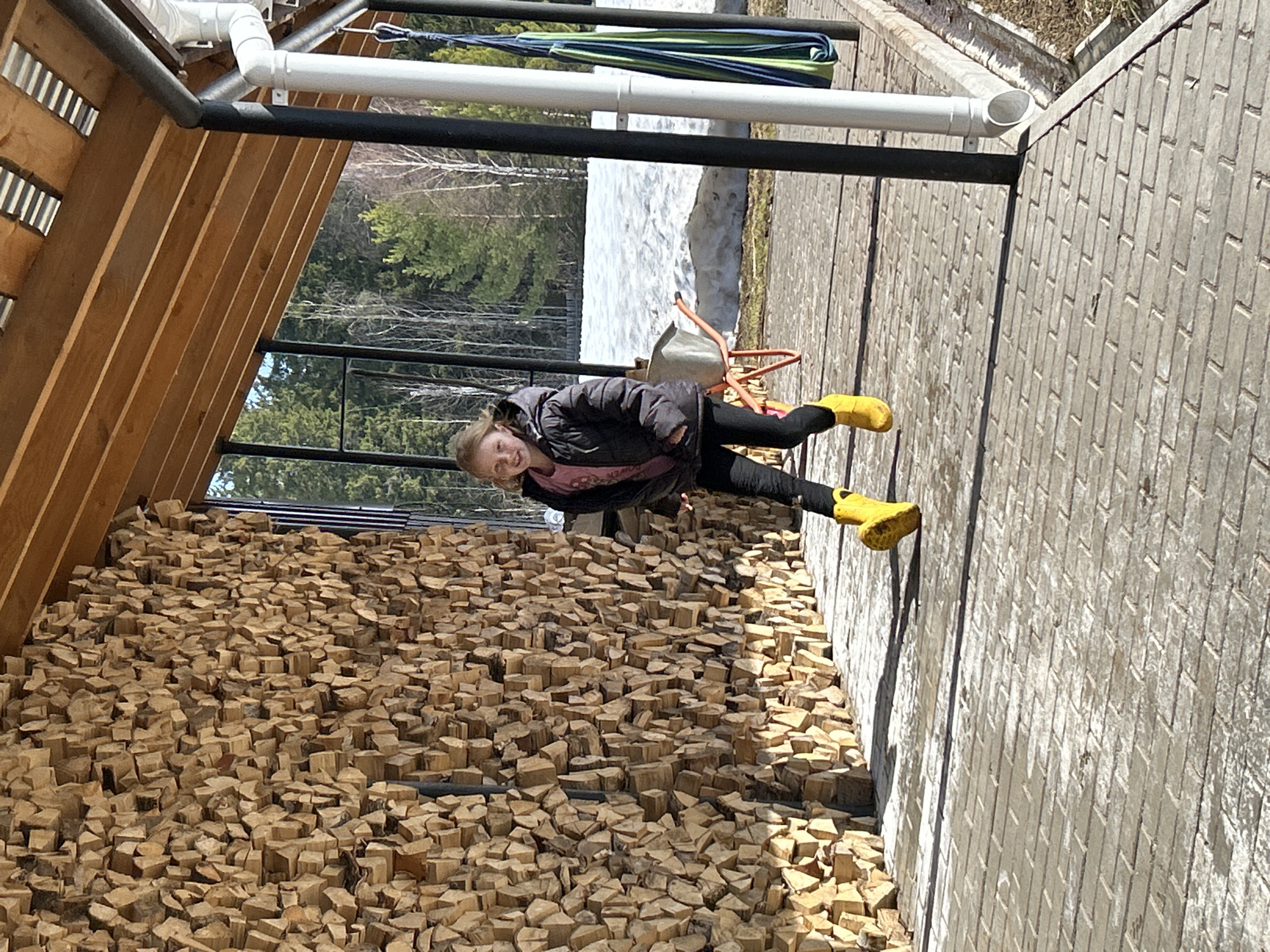 A young girl in a black jacket, black pants, and yellow boots stands on a brick patio in front of a large pile of split firewood