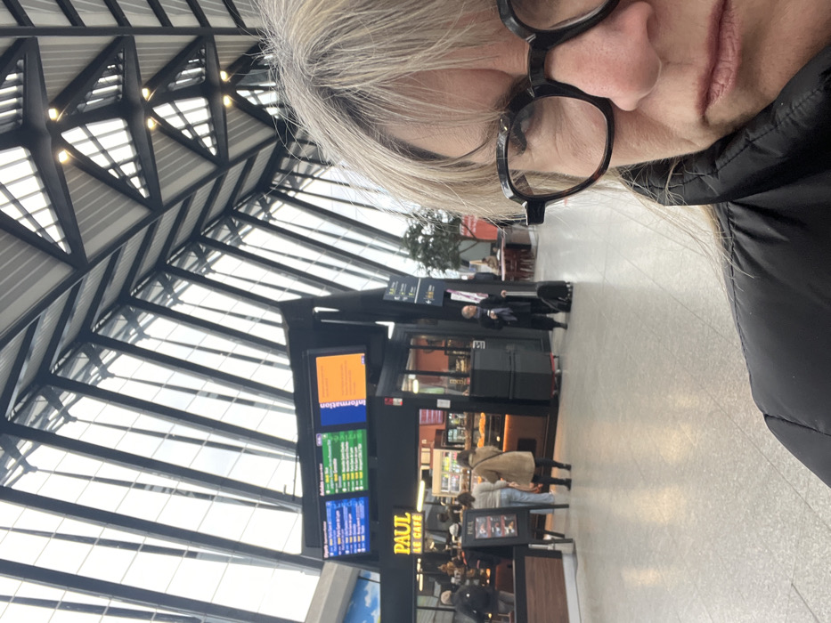 The image depicts an indoor scene at the Lyon-Saint Exupéry TGV station in Colombier-Saugnieu, France, identifiable by its unique geometric glass and metal roof architecture. In the immediate foreground, positioned to the right, is a partial view of an individual with blonde/grey hair, wearing dark, round-rimmed eyeglasses and a dark padded jacket; only their right eye, nose, mouth, and shoulder are visible. In the midground, a "PAUL LE CAFE" kiosk with a dark exterior and yellow lettering is prominent. Above the kiosk, three digital display screens are visible: the left screen shows "Départs" (Departures) in blue, the middle screen displays "Arrivées" (Arrivals) in green, and the right screen presents "Information" in orange. Several other individuals are present. Multiple patrons are clustered around the "PAUL LE CAFE" counter; one person in a light brown coat stands with their back to the camera, facing the counter. To the right of the kiosk, a person dressed in dark clothing stands next to a black rolling suitcase. The floor is a light-toned, possibly tiled or polished surface, and the area is illuminated by both natural light filtering through the glass roof and overhead artificial lighting. In the background, to the far right, a small seating area with tables, chairs, and a potted plant is dimly visible.