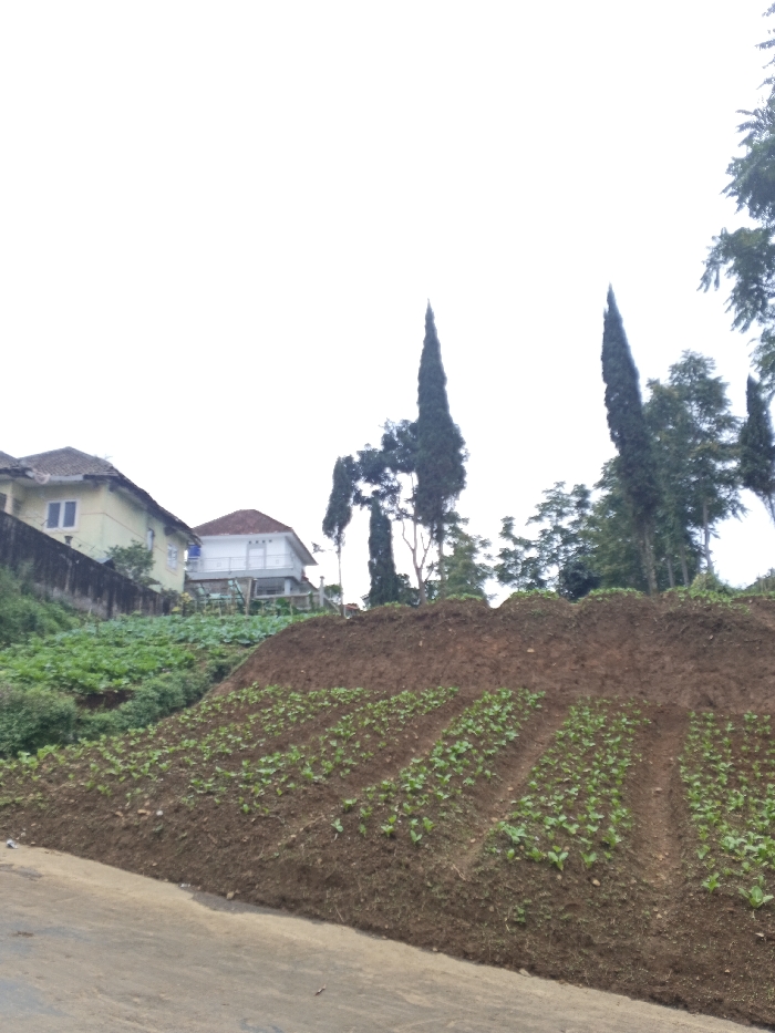Rows of young crops are planted on a steep, muddy hillside. Behind the hill are several tall, thin evergreen trees and deciduous trees. Two houses sit on the next terrace up the hill, partially obscured by vegetation. The sky is overcast and mostly white. A paved road is visible in the foreground, implying the hillside farm is beside a thoroughfare.