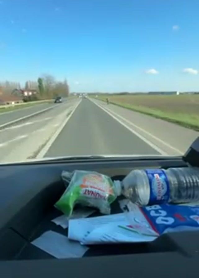 The view from inside a vehicle, presumably a truck, shows a straight, multi-lane road under a clear blue sky. Two cyclists ride on the shoulder of the road, moving in the same direction as the vehicle. A few other cars are visible in the distance. On the dashboard in front of the viewer is a small storage area containing a bottle of Cristaline water, a packet of Baunat snacks, and various wrappers.