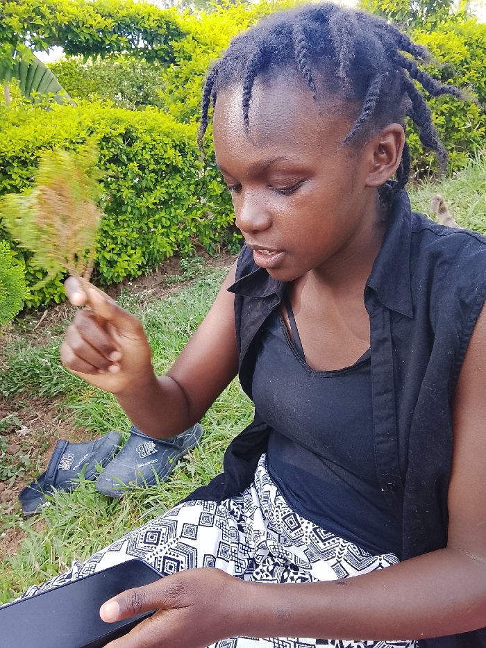 The scene is set outdoors in Mahiakalo ward, Kenya. A young individual with dark skin and black hair styled in multiple short twists or braids is depicted. The individual is wearing a black sleeveless collared shirt over a black V-neck top and a skirt featuring a black and white geometric pattern. Their gaze is directed downwards and slightly to their right, with lips slightly parted, suggesting concentration or observation. The left hand holds a black smartphone horizontally on their lap. The right hand is raised and holds a small, light brown, dried branch or cluster of leaves, which appears blurred due to motion. On the green grassy ground to the left of the individual, a pair of black "BALANCED" branded clogs are visible. The background consists of dense, vibrant green foliage, likely shrubs or bushes, under bright daylight.