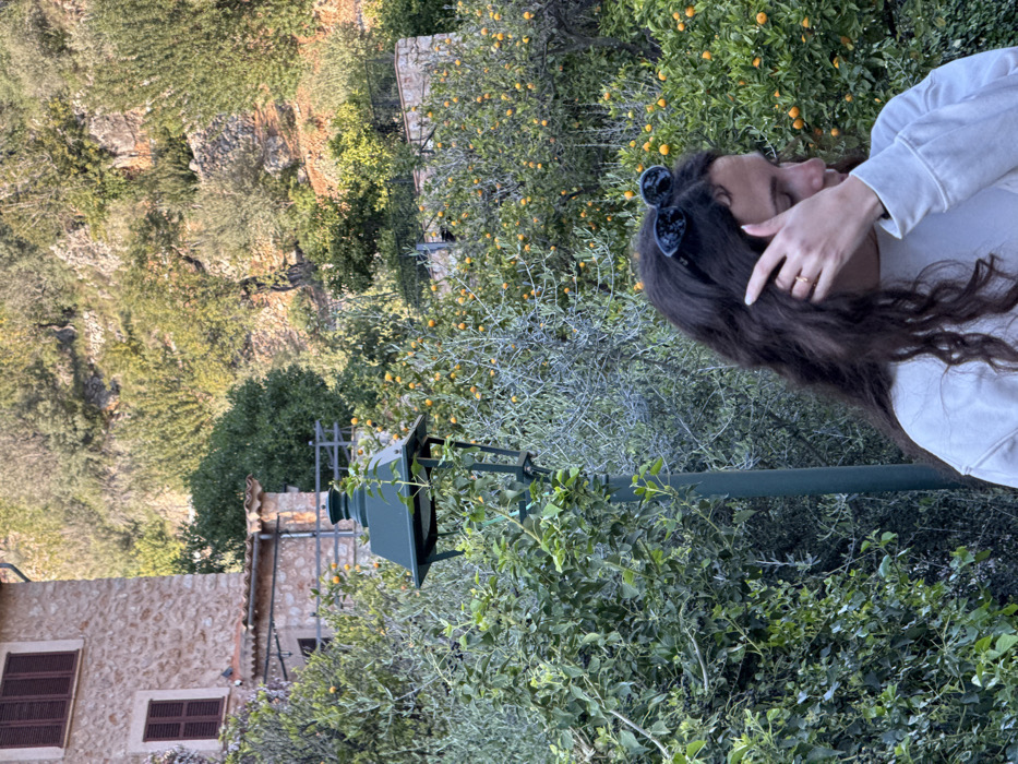 The scene depicts an outdoor setting in Fornalutx, Spain, characterized by terraced Mediterranean vegetation and traditional architecture under natural daylight. In the foreground and midground, a female individual is partially visible, positioned amongst dense green foliage. She has long, dark, wavy hair and is wearing dark-colored sunglasses pushed up onto her head. Her right hand, adorned with a simple ring on the ring finger, is raised to her temple area, touching her hair or forehead. She is wearing a light-colored, long-sleeved top and is looking downwards or to her right. To the left of the individual, a dark green, ornate streetlamp or garden lamp post stands upright, partially obscured and intertwined with green vines and leaves. The surrounding vegetation includes numerous bushes and trees laden with small, round, orange-colored citrus fruits, consistent with orange trees. In the background, a traditional stone house with light-colored stone walls and a reddish-brown tiled roof is visible on the upper left. It features two windows with closed dark brown wooden shutters. Below the upper window, a small outdoor area with a railing is present. Beyond the house and midground vegetation, a steep, rocky hillside rises, densely covered with varied green trees and shrubs. Exposed reddish-brown rock formations are visible on the slope. Stone walls and terracing are present across the hillside, and a wooden fence or railing is discernible in the mid-distance. The light suggests a bright, daytime environment.