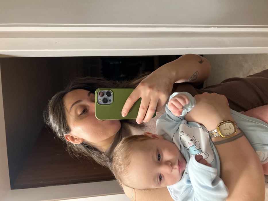 A woman with dark hair is holding a baby in her arms while taking a selfie. The woman is wearing a brown top and a gold watch, and has tattoos on her arms. The baby is wearing a light blue onesie with a cartoon character on it. The woman is holding a green iPhone in her hand. The background is a dark colored wall with white molding at the top. The photo is taken at an angle.