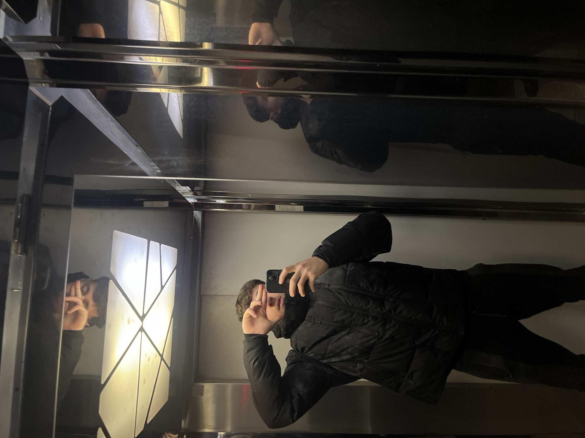 A person stands inside an elevator, taking a selfie in a mirror. The person is wearing a black puffer jacket and black pants. They are holding a smartphone in their left hand. The elevator features a patterned light fixture on one wall. No specific landmarks or features are visible to identify the exact location as Plovdiv, Bulgaria.