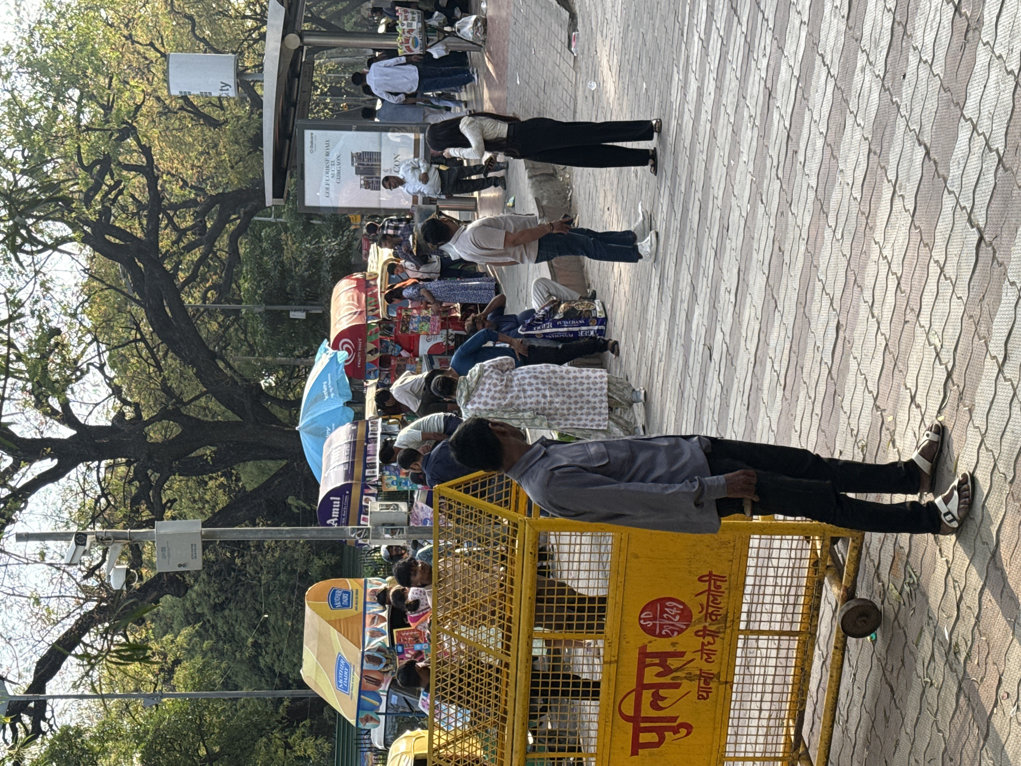 The image portrays an outdoor urban street scene in Lodhi Colony, Delhi, India. This location is explicitly identified by a yellow metal police barricade in the foreground, displaying the red Hindi text "पुलिस थाना लोधी कॉलोनी" (Police Station Lodhi Colony) and "SD 29/249". In the foreground, a man stands with his back partially to the viewer, facing the street activity. He wears a grey long-sleeved shirt, dark trousers, and white sandals, holding a dark object in his right hand. The yellow barricade, equipped with wheels, extends across the lower left of the frame. The midground is densely populated with individuals and commercial activity. Multiple street vendor stalls are present, including two with yellow canopies advertising "MOTHER DAIRY" ice cream, and one with a blue canopy marked "Amul" for ice cream. Other stalls with red canopies are also visible. A crowd of people congregates around these stalls and auto-rickshaws, suggesting active commerce. To the right of the central cluster, a man in a light-colored polo shirt and jeans faces a woman dressed in a white long-sleeved top and black wide-leg pants. The woman holds a smartphone to her ear or is in the process of capturing an image. The background is dominated by large, mature trees with abundant green foliage. A tall metal pole on the left supports two CCTV cameras and a grey control box labeled "CCTV SYSTEM". On the right, a public shelter or bus stop structure features an advertising panel for "GOLF COURSE ROAD, SEC-63, GURGAON". Additional pedestrians are scattered throughout the deeper background. The ground surface is paved with light-colored interlocking concrete pavers arranged in a repeating wave pattern. The scene is illuminated by natural daylight, casting moderate shadows.