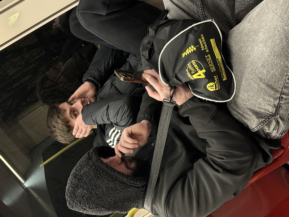 Two men sit on a bus seat covered in red fabric. The man in the foreground wears a gray, furry hat and black jacket, with a black strap across his chest. Next to him sits a younger man with short brown hair in a black jacket, looking towards the camera, with one hand near his mouth. A phone rests in his other hand. A black and yellow bag sits between them, beside a person wearing gray jeans. A window is behind the younger man, reflecting the scene.