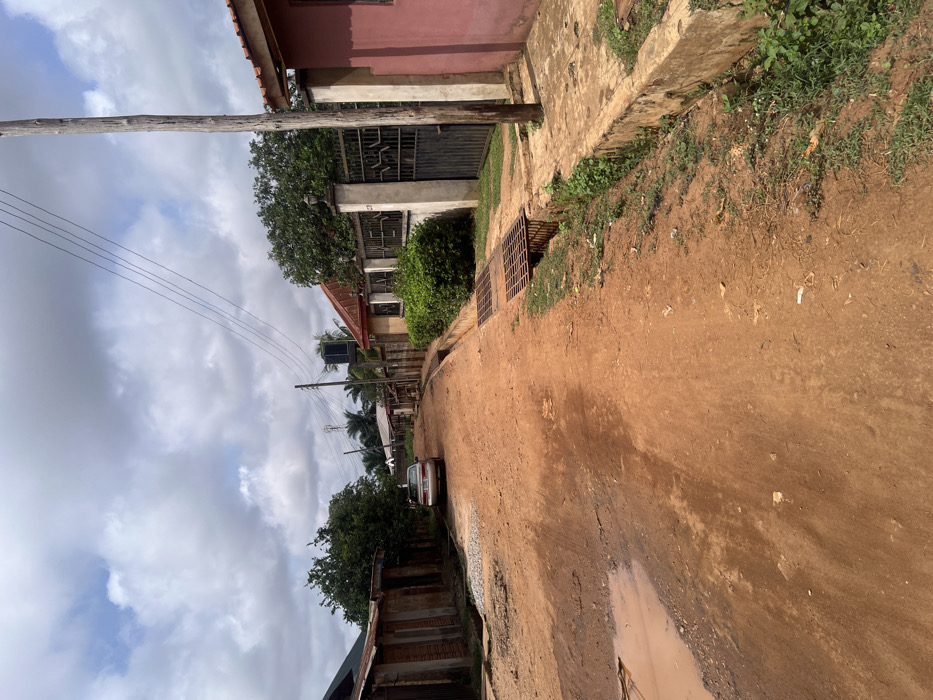 dirt road in Ita Oniyan, Nigeria, with a single, parked, silver car in the middle of the road. The road is lined with buildings on both sides, and there are power lines running overhead. The buildings on the right are painted a reddish brown color. The road is dusty and dry, with some small puddles of water. There is a concrete drainage ditch on the right side of the road. The road is narrow, only wide enough for one car. The road is in a residential area, with no people present. The sky is partly cloudy and blue. The surrounding landscape is lush and green, with a few trees. The view is from street level, looking down the road. The image was likely taken on a sunny day.